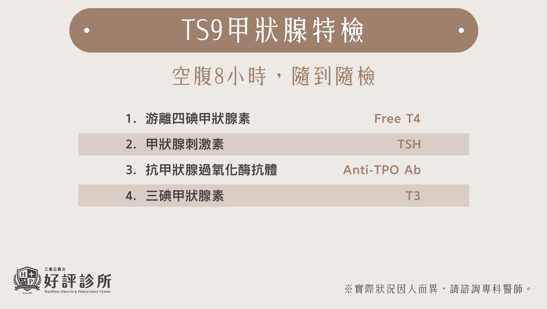 - 抗甲狀腺抗體(如 Anti-TPO、Anti-Tg)(選項):協助診斷自體免疫性甲狀腺炎,如橋本氏症或葛瑞夫茲病