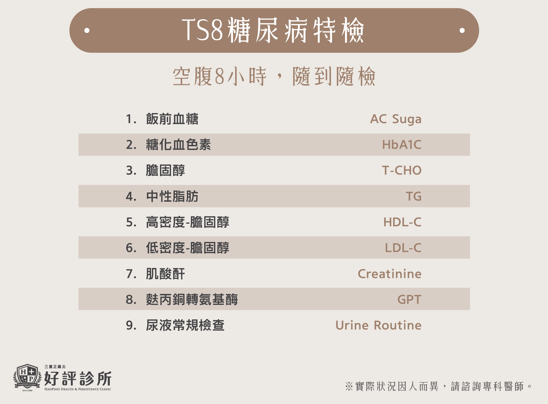 TS8 糖尿病特檢套組,針對血糖控制、脂質代謝與腎功能進行整合性檢測,包括: