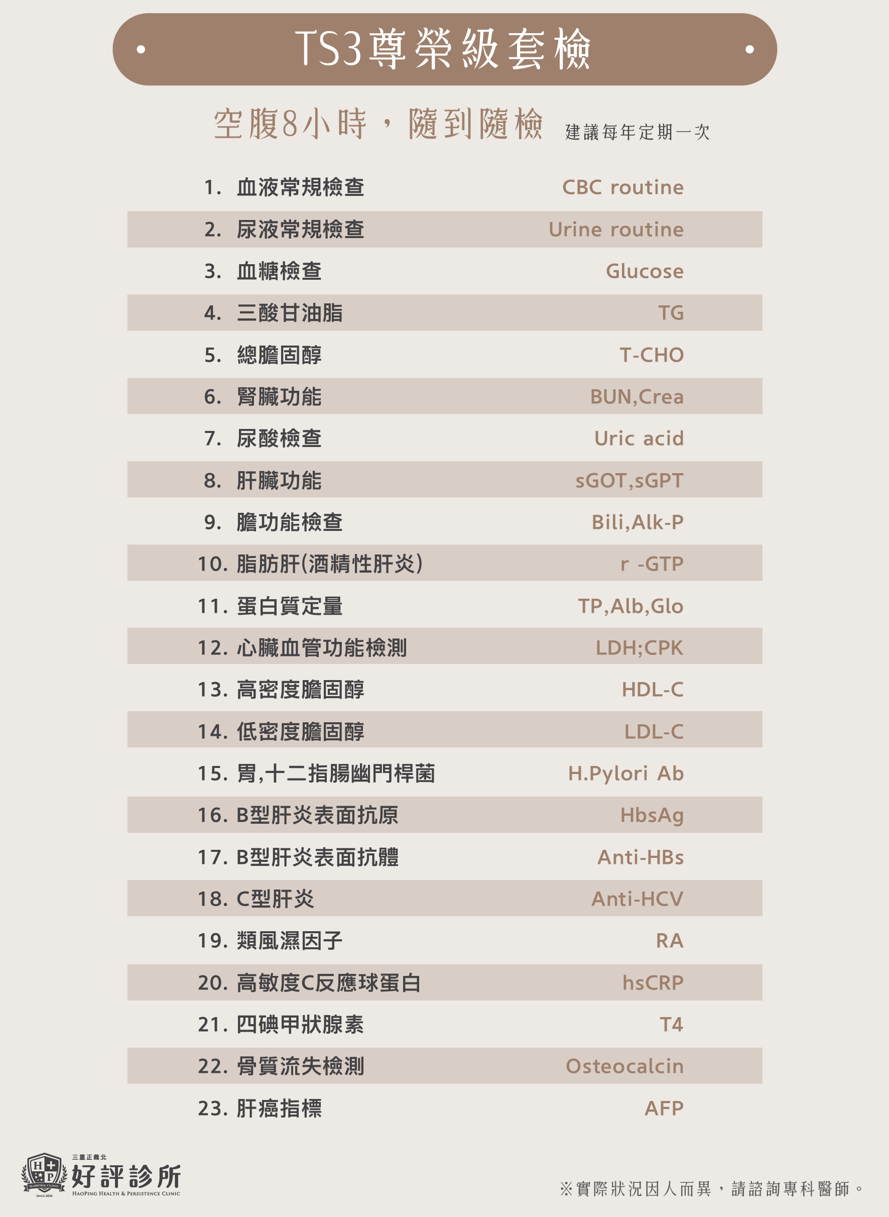 - 血糖與血脂:檢查血糖、三酸甘油酯、總膽固醇、HDL、LDL,有助預防三高與代謝症候群。