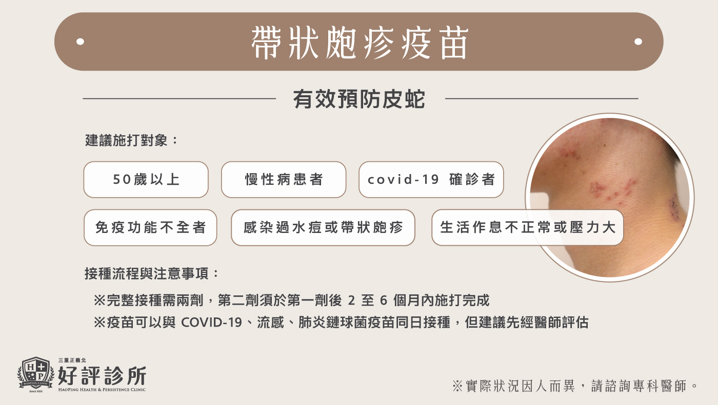 - 疫苗可以與 COVID-19、流感、肺炎鏈球菌疫苗同日接種,但建議先經醫師評估