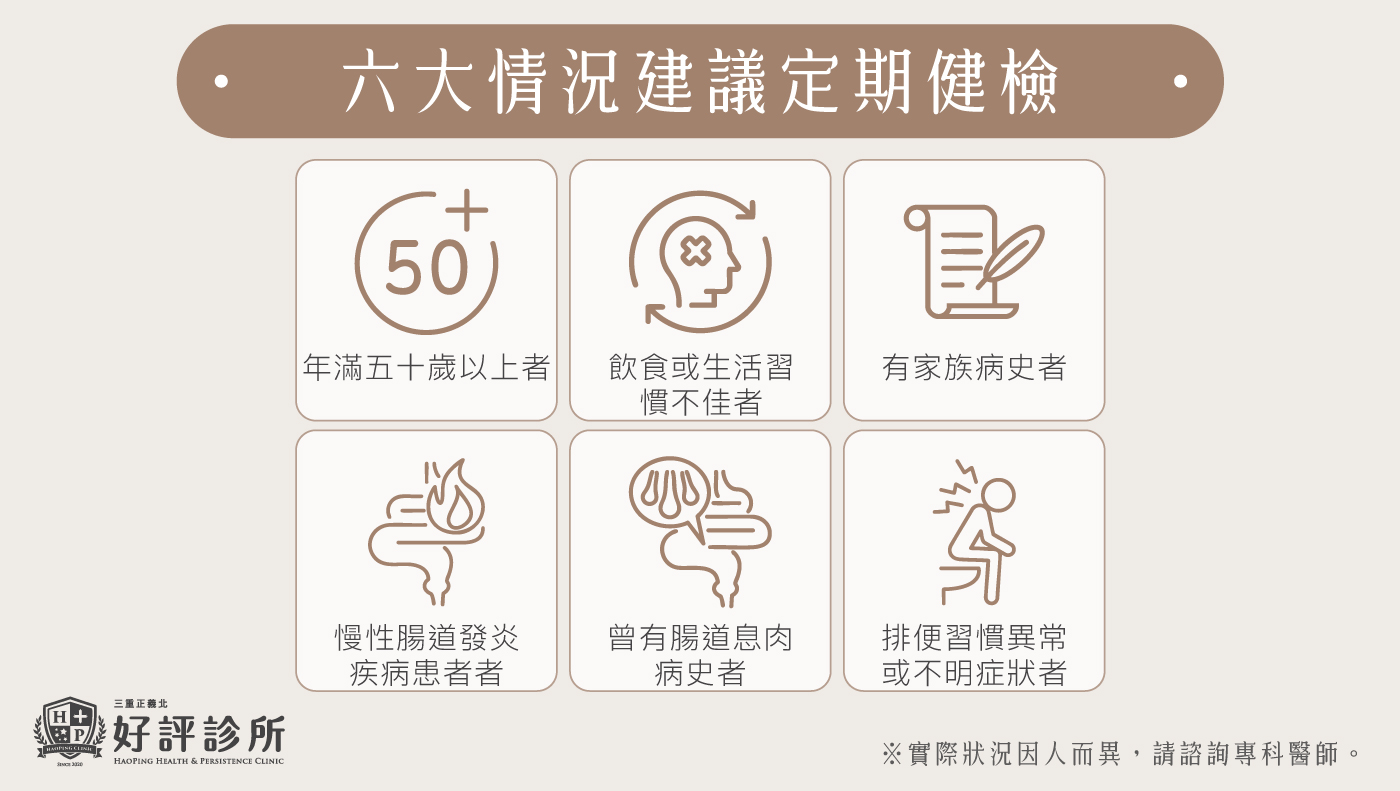 - 建議至少做過一次完整的大腸鏡檢查 糞便潛血檢查可能有偽陰性,鏡檢更能精準掌握腸道狀況