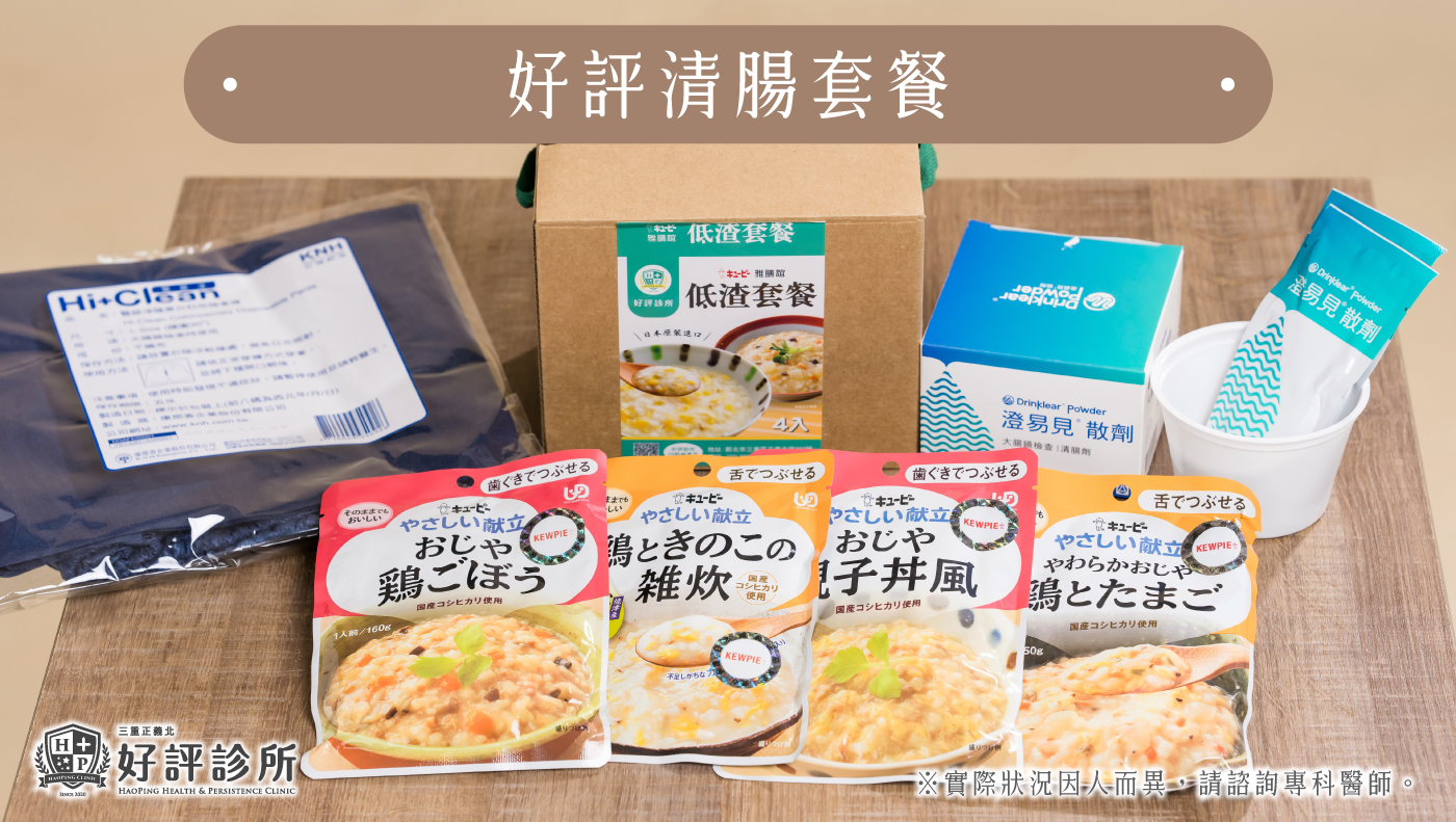可使用好評診所提供的「好評診所清腸套餐」,低纖維料理包4包、清腸藥、2包、拋棄式褲子1件,步驟如下:
