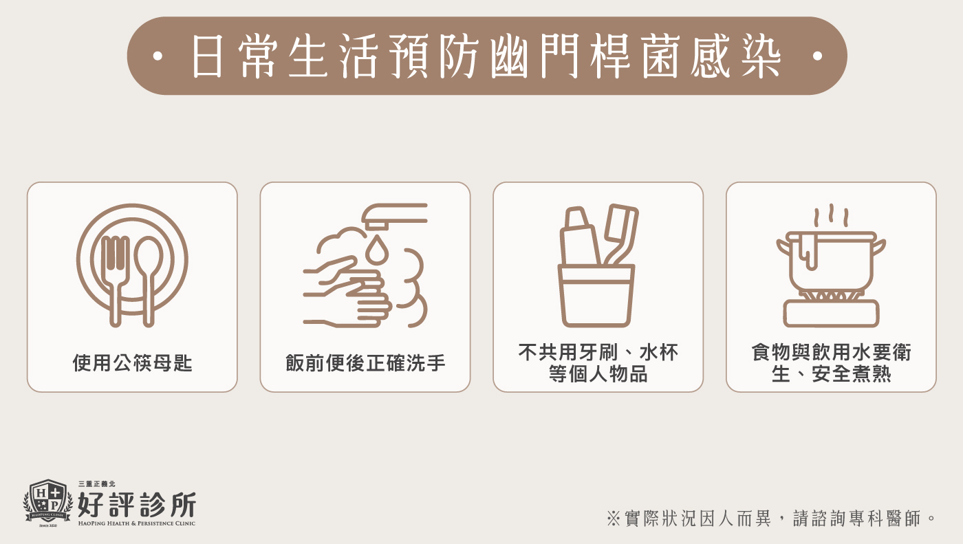 幽門桿菌可透過口口或糞口傳染,如共用餐具、牙刷、親密接觸。家庭成員間容易互相傳染,尤其從小共食習慣下。建議使用公筷母匙、分餐是重要預防方式。